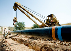 Bajada a la zanja de uno de los tramos finales del desdoblamiento del oleoducto Zaragoza-Torrejón. |