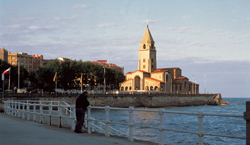 Vista de la iglesia de San Pedro desde la playa de San Lorenzo, en Gijón. |
