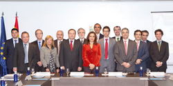 Representantes del Gobierno y de las empresas colaboradoras (el director general de CLH Aviación, Jorge Guillén, quinto por la derecha), tras la firma del acuerdo. |