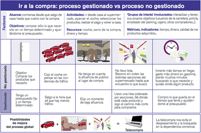 Veamos la comparación de gestionar un proceso y no hacerlo poniendo como ejemplo ir a hacer la compra. En el proceso gestionado, primero pensamos ‘Qué’ debemos o queremos comprar, en base al ‘para Qué’, definiendo más tarde ‘Donde’ vamos a ir y ‘Cómo’ lo vamos a hacer para ser eficientes. Por el contrario, en el no gestionado somos menos eficientes, no conseguimos los objetivos propuestos e, incluso, no estamos satisfechos.