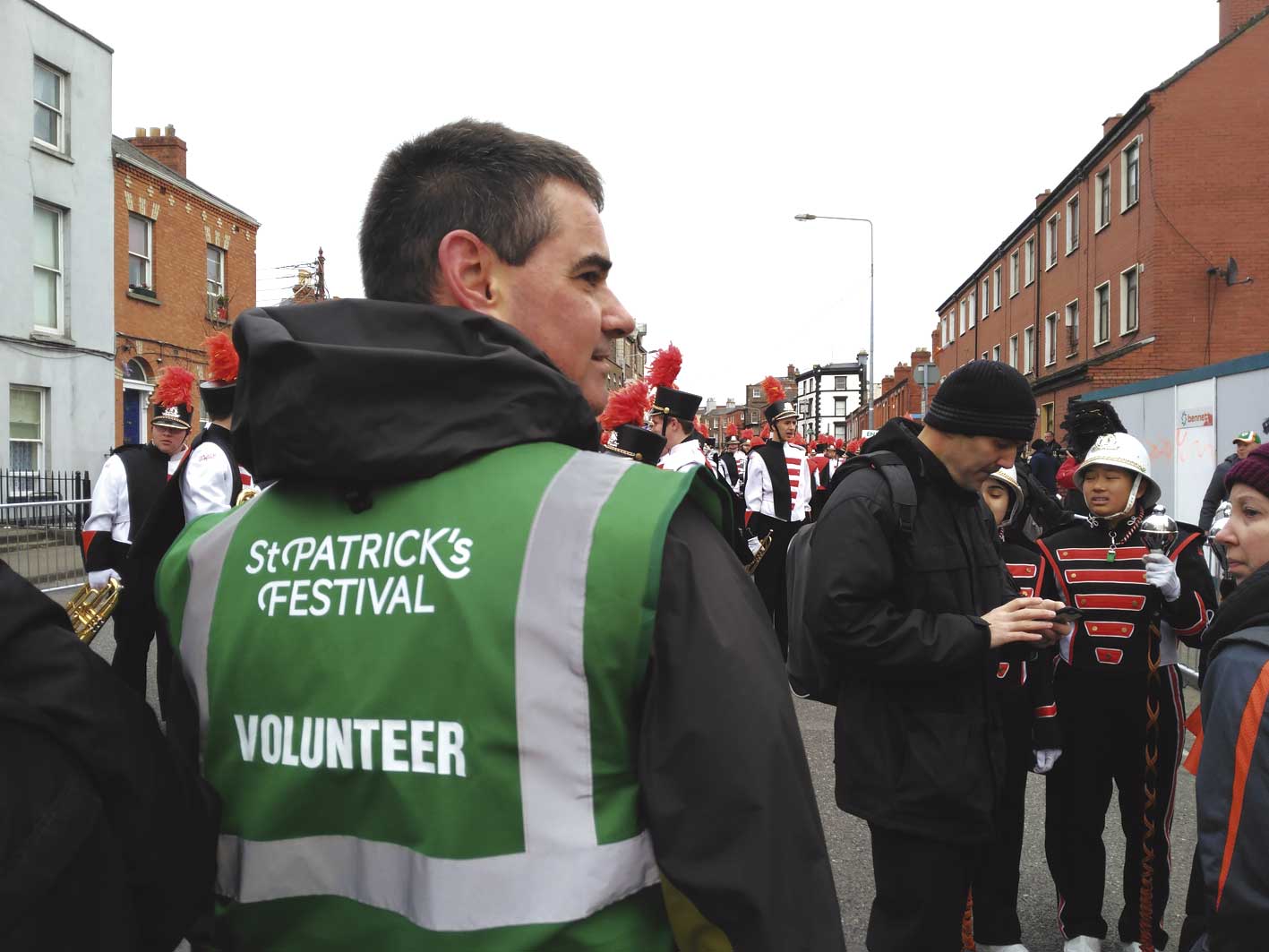 El 17 de marzo es San Patricio, la fiesta nacional más celebrada a nivel internacional, un día en que todo el mundo quiere ser irlandés. Viviendo en Dublín, he querido disfrutar desde dentro del desfile que se celebra en esa fecha, el acto más señalado de un festival que se alarga cinco días. Como uno de los más de 200 ‘personal assistant’ involucrados, mi función era ayudar en la organización, dando instrucciones a los cientos de participantes para que estuvieran en su puesto antes del comienzo y comprobando las medidas de seguridad durante todo el proceso. Además, porté la bandera de una de las bandas de música participantes, caminando delante de ella durante todo el recorrido.
